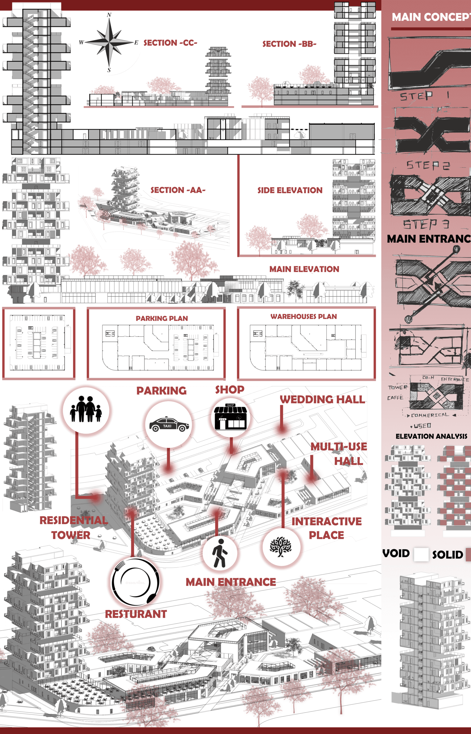 The mixed-use construction project aims to serve the largest segment of the residents in the area. The project includes commercial markets, a multipurpose hall, co-working spaces, offices, parking, restaurants, in addition to a residential tower that offers several apartments of varying sizes.